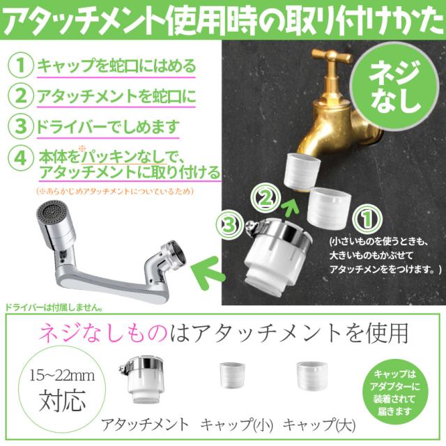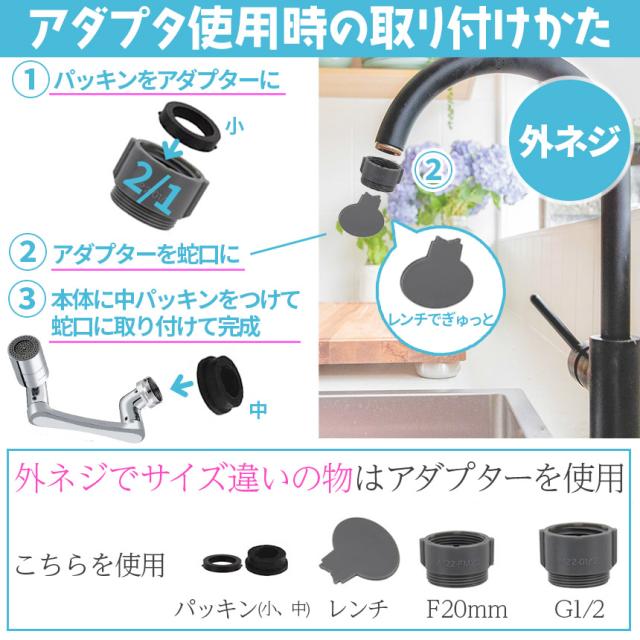 【ぐるぐる自由自在!キッチンシャワー】SNSでも話題!バブルとシャワーの2WAYで360°x4か所首が回り、角度も変えられる、ほとんどの蛇口に適用する高機能ヘッドです♪バブルで優しく&シャワーで勢いよく!の2WAYがいいんです!外ネジタイプ、内ねじタイプ用アタッチメント、万能アタッチメントが付属するので、ネジがないタイプも対応(約1.5cmから2.2cmまで)可能です。