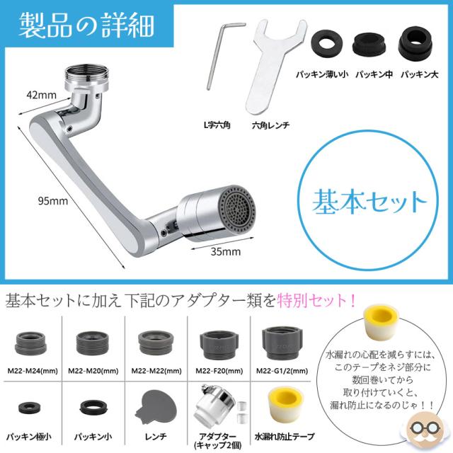 必要なすべてのアクセサリが付属しています。蛇口にネジ式の口を回すだけで設置でき、配管工は必要ありません。 家庭でのほとんどの蛇口に適しています。また、水漏れ防止テープもついているので、気になる場合は、ネジ部分に数回巻いて、それから取り付けてみて下さい。(※適応しない蛇口もあります、画像の説明をご覧になって、ご家庭のものが適応するかご確認くださいませ。)