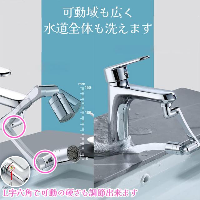 あらゆる箇所が360度回転し、水流の方向を自由に変更できます。特にシャワーモードではシンクの掃除も隅々までとってもしやすいです。また、上向きのもなるのでそのまま顔を洗ったりできます♪