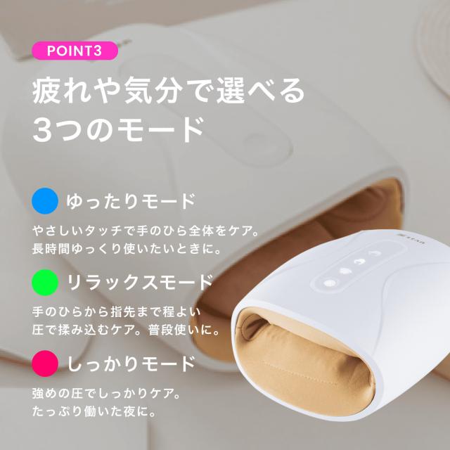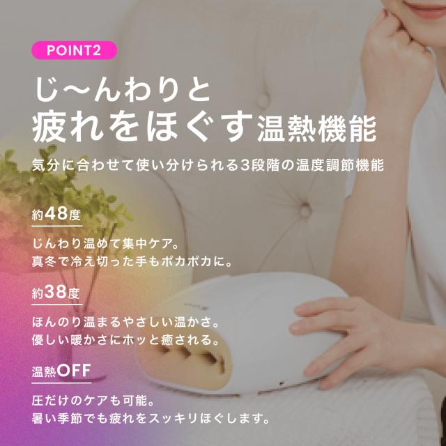『温熱×空気圧』で手全体を癒し、リラックスできるハンドケアグッズです。普段から長時間PCやスマホで手を酷使する方、仕事で手をよく使う方、指の関節などが疲れやすい方など、自宅に手軽にケアしたい方におすすめです。