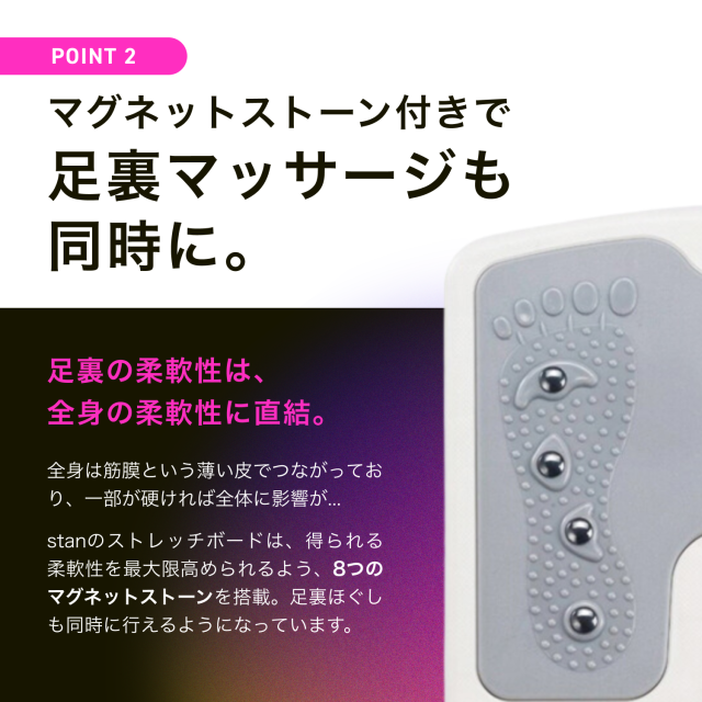 両足合計8個のマグネットストーンが足裏から筋肉をほぐす効果を助けます。