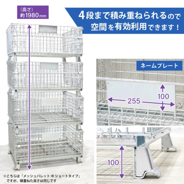 ●三価クロムメッキ仕上げで錆に強く、荷物の保管に最適です ●工事現場での資材置き、工場での部品の保管に活躍します ●メッシュ構造で軽量ながら強い強度があるので、様々な使い方が可能です ●前面扉の上部は開閉できるので、物の出し入れの際に便利です ●4方向からフォークの差込みが可能なので、フォークリフトでの運搬が容易です ●組立てて4段まで積み重ねできるので、空間を有効利用できます ●折りたたみ時にはコンパクトになり、積み重ねて収納する事ができます ★本品はキャスターは付いておりません 【関連商品】 ・メッシュパレット 中 幅1000×奥行800×高さ850mm(1個売り) ・メッシュパレット 中 キャスター付き 幅1040×奥行820×高さ910mm(1個売り) ・メッシュパレット 中 ショートタイプ 幅1000×奥行800×高さ510mm(1個売り) ・メッシュパレット 大 幅1200×奥行1000×高さ900mm(1個売り) ・メッシュパレット 大 キャスター付き 幅1200×奥行1000×高さ960mm(1個売り) ・メッシュパレット 大 ショートタイプ 幅1200×奥行1000×高さ510mm(1個売り) 品番:MP-SL |