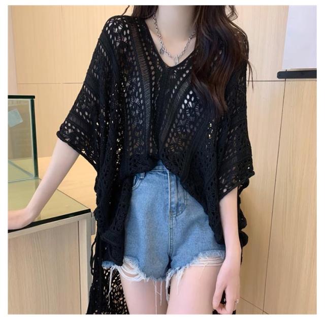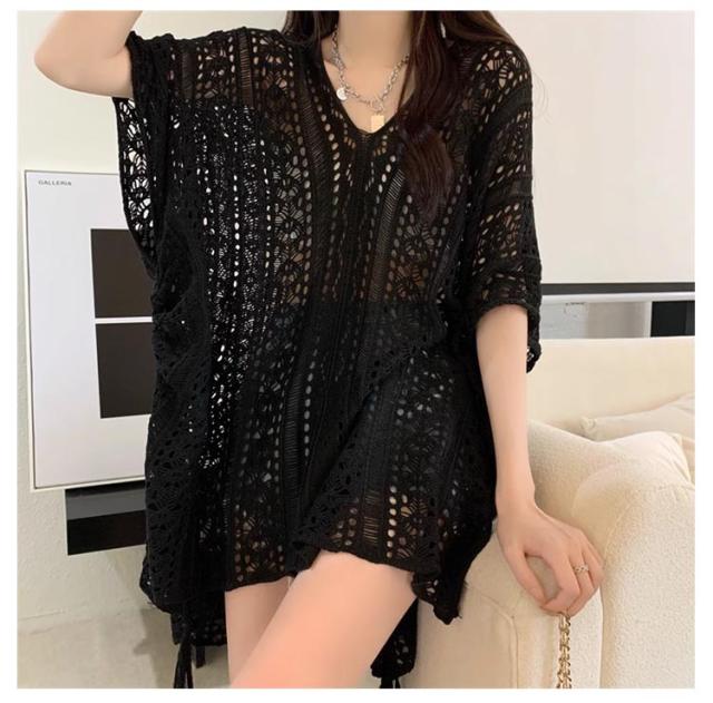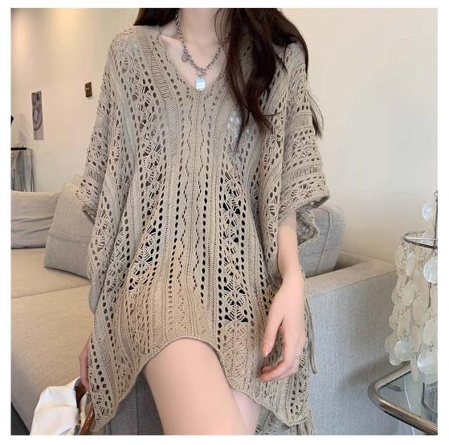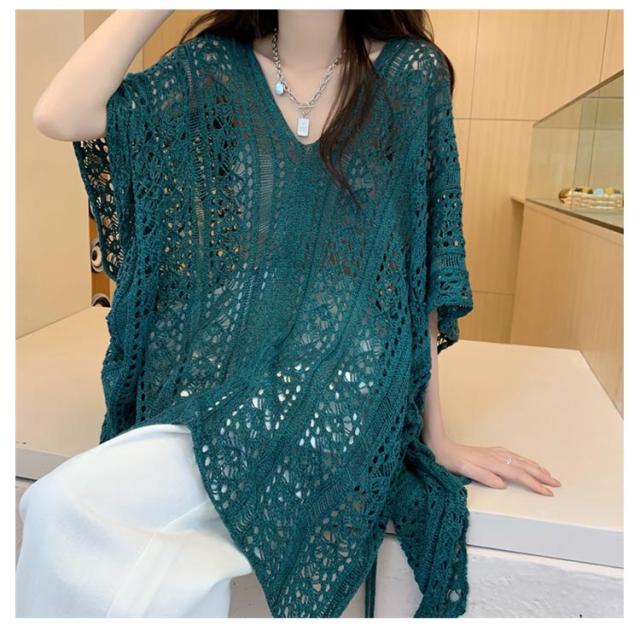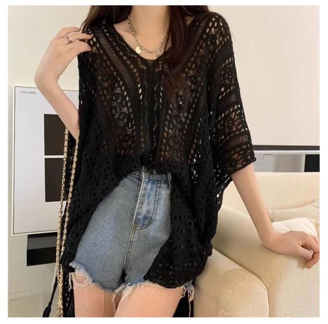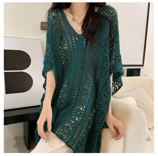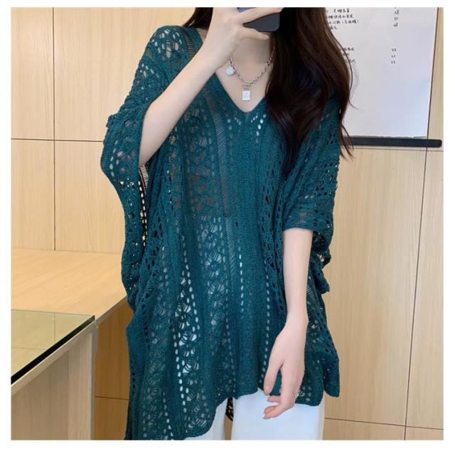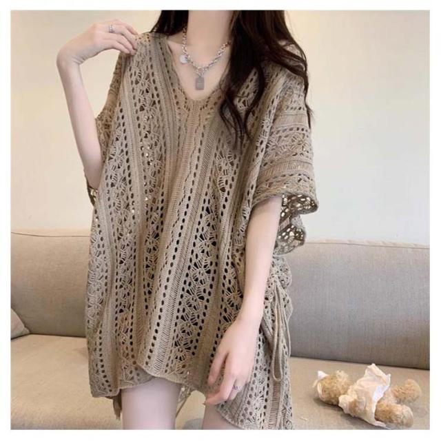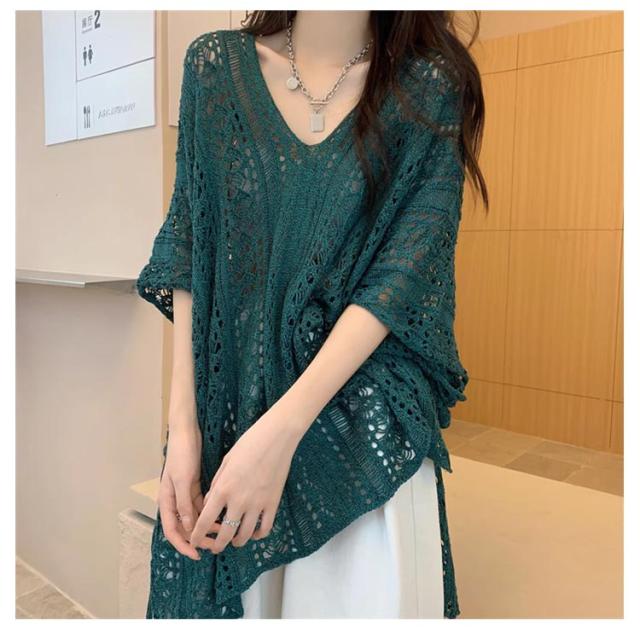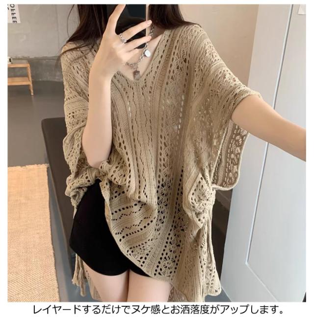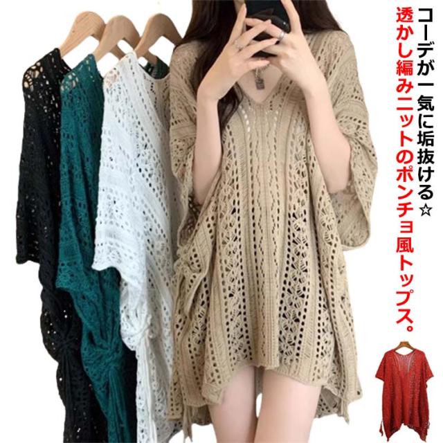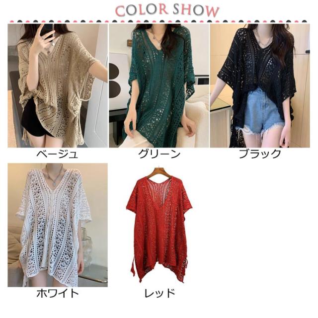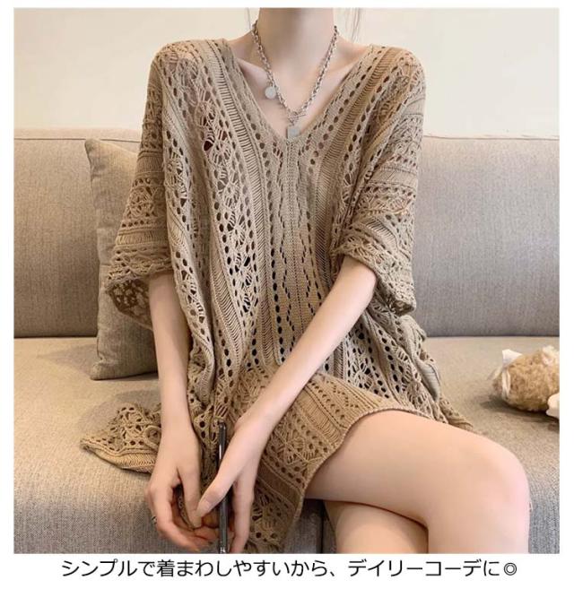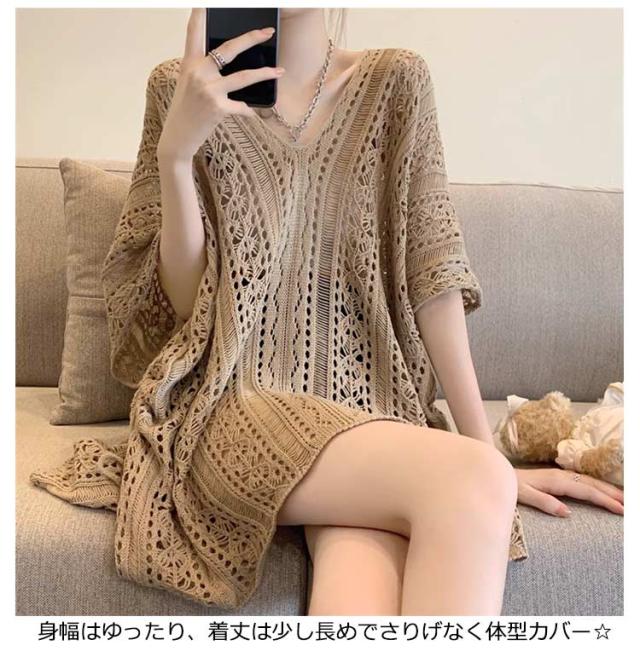 半袖 レジャー ゆったり Vネック レディース 透かし編みニット サマーニット 透け感 夏服 ふんわり 透かし編みニット 体型カバー 五分袖 日焼け防止 ドルマンスリーブ 冷房対策 無地 海 プール リラックス感 キレイめ お洒落