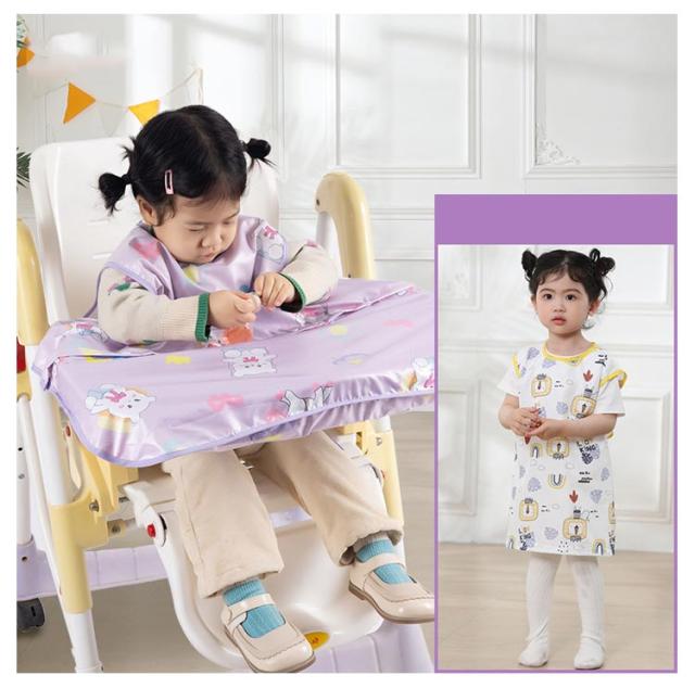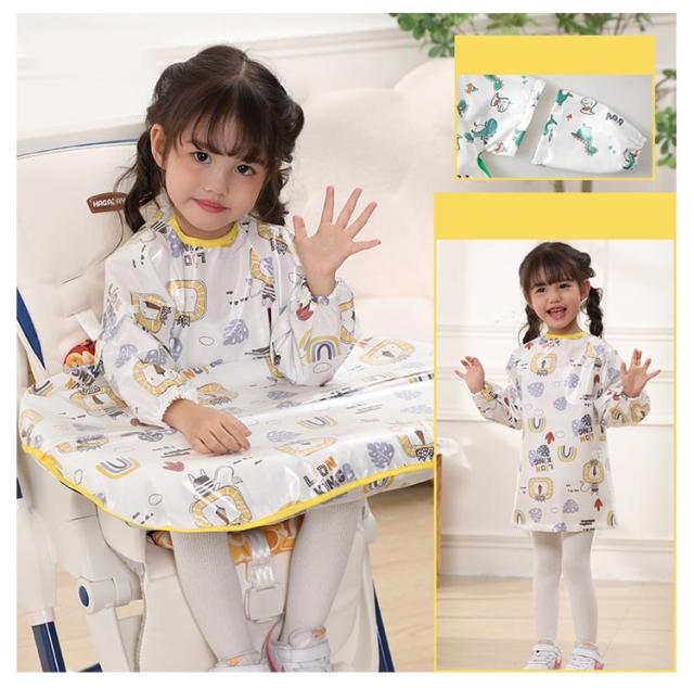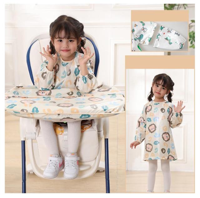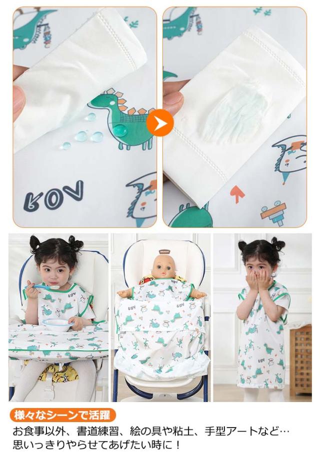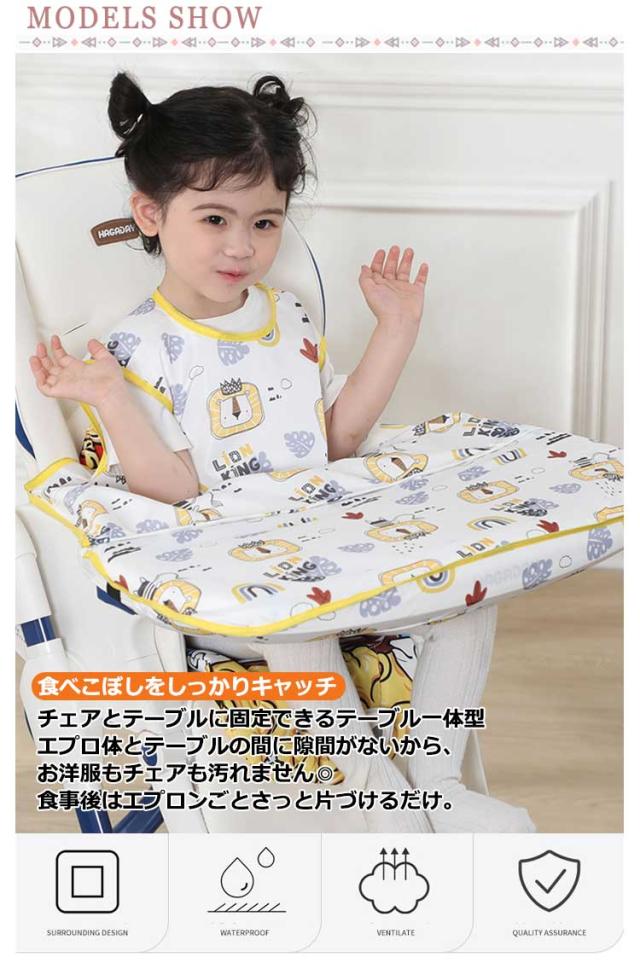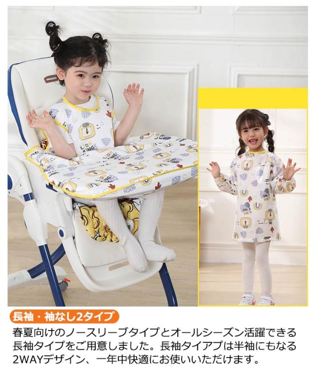 | 後片付けのストレスから解放!吸盤付食器使用可能。 普通のロングエプロンに変身可能♪ 【食べこぼしをしっかりキャッチ】チェアとテーブルに固定できるテーブル一体型エプロ体とテーブルの間に隙間がないから、お洋服もチェアも汚れません◎食事後はエプロンごとさっと片づけるだけ。 【吸盤付食器使用可能】テーブルクロス一体型エプロンはスナップボタンデザインで吸盤付き食器も使えます。さらに、テーブルクロス部分は取り外しできるから、普通のロングエプロンとしても使える2WAY仕様。 【長袖・袖なし2タイプ】春夏向けのノースリーブタイプとオールシーズン活躍できる長袖タイプをご用意しました。長袖タイアプは半袖にもなる2WAYデザイン、一年中快適にお使いいただけます。 【お手入れ簡単】防水素材で全身すっぽりカバーするか、ジュースや汁物をこぼしても洋服などに浸み込むのを防ぎ、全身お着替えやお洗濯の負担を軽減できます。洗濯機で丸洗いできるから、お手入れとても簡単。 【様々なシーンで活躍】お食事以外、書道練習、絵の具や粘土、手型アートなど…思いっきりやらせてあげたい時に! 【ハイチェアもローチェアも適応】市販のほとんどのベビーチェアに使えます。 | |