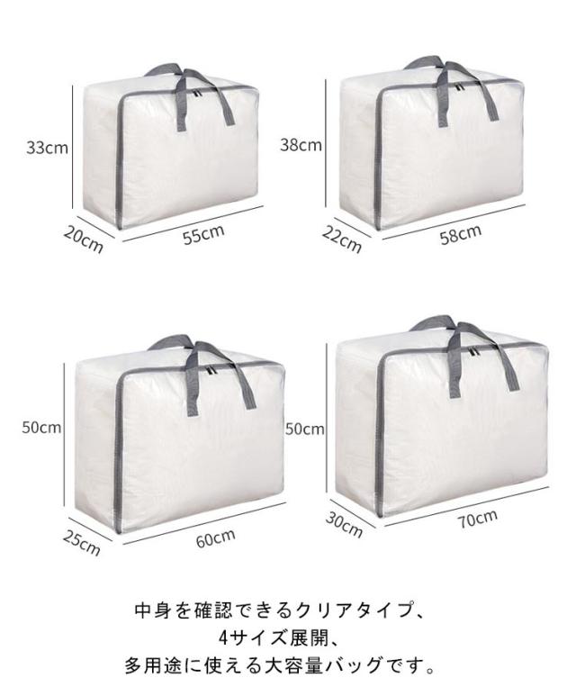 | 中身を確認できるクリアタイプ、4サイズ展開、多用途に使える大容量バッグです。 便利な持ち手付き、荷物を運ぶのに大変便利です。 ダブルファスナーなので、間口が大きく開いて荷物が入れやすく取り出しやすい。 防水機能付き、引っ越し、掃除、旅行やキャンプなど様々なシーンで活躍する便利な大容量バッグ。 シンプルなデザインですので、年齢や性別を問わずにお使いいただけます。 | |