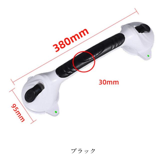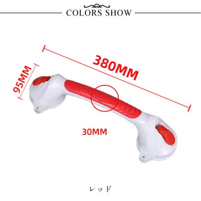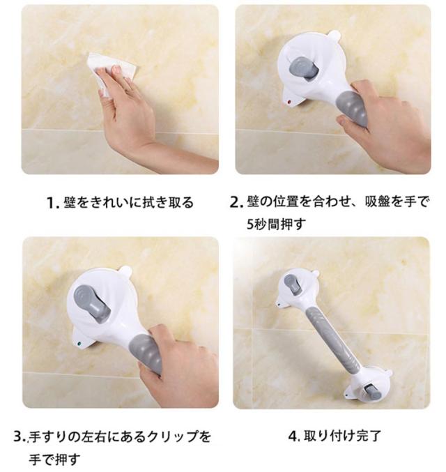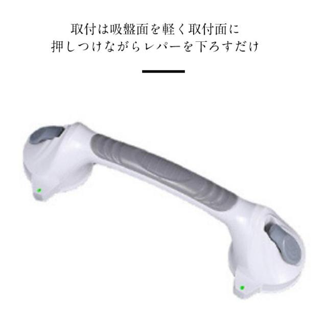 | 強力吸盤式手すり 浴槽の中などの狭い場所に取り付けやすいサイズです 取付は吸盤面を軽く取付面に押しつけながらレパーを下ろすだけ | |