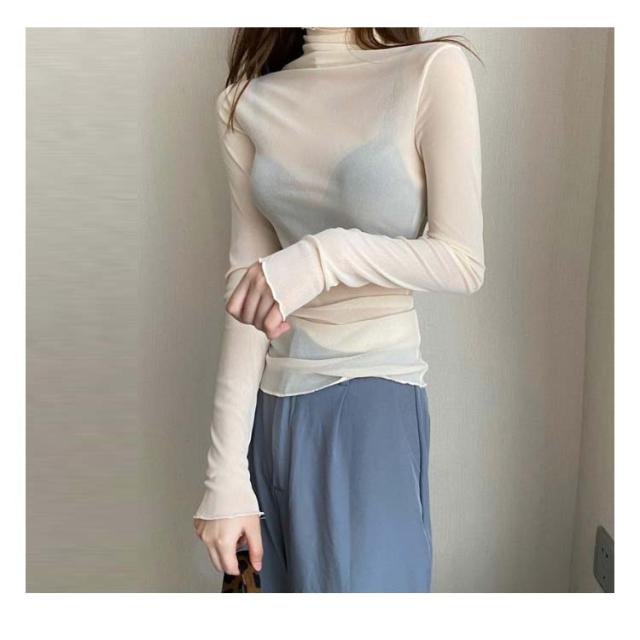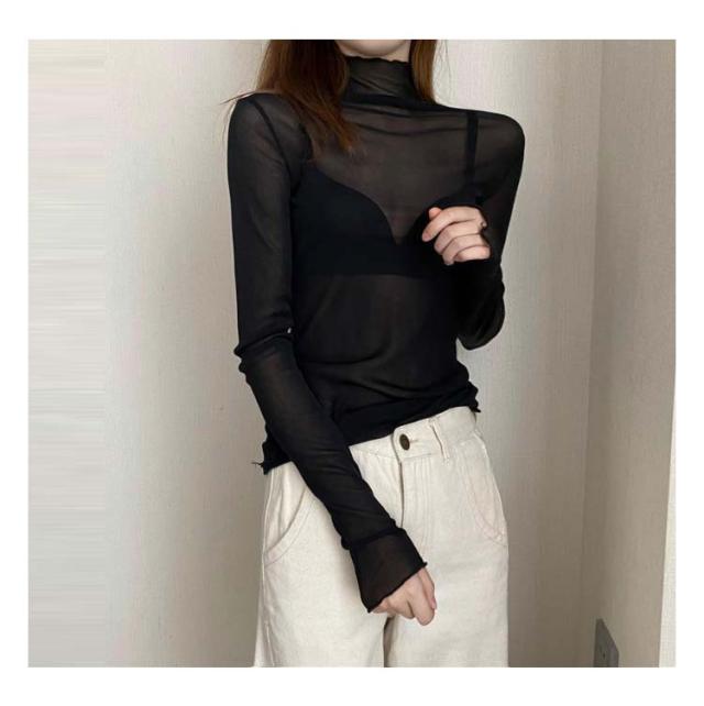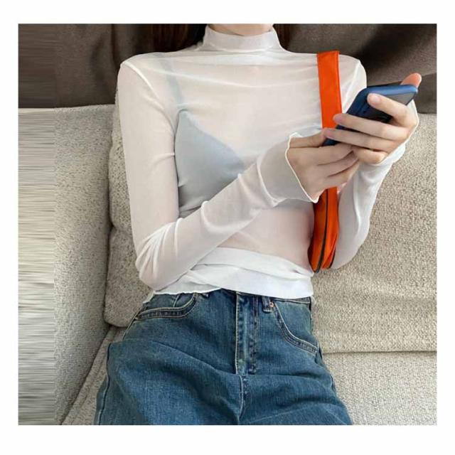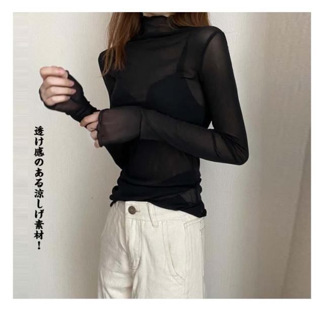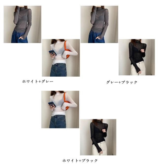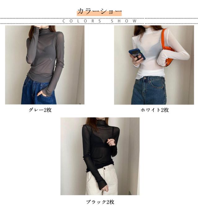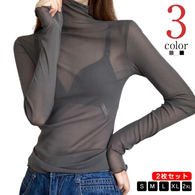 【2枚セット】ハイネック レディース シアートップス 透け感 メッシュ プルオーバー 重ね着 フリル カットソー タートルネック レイヤード シアー Tシャツ 長袖 春 夏 インナー 【2枚セット】ハイネック 紫外線対策 シースルー ロンt おしゃれ 無地