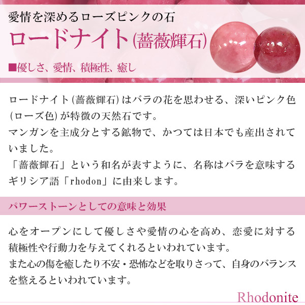 ロードナイト(薔薇輝石)は心をオープンにして優しさや愛情の心を高め、恋愛に対する積極性や行動力を与えてくれるといわれています。