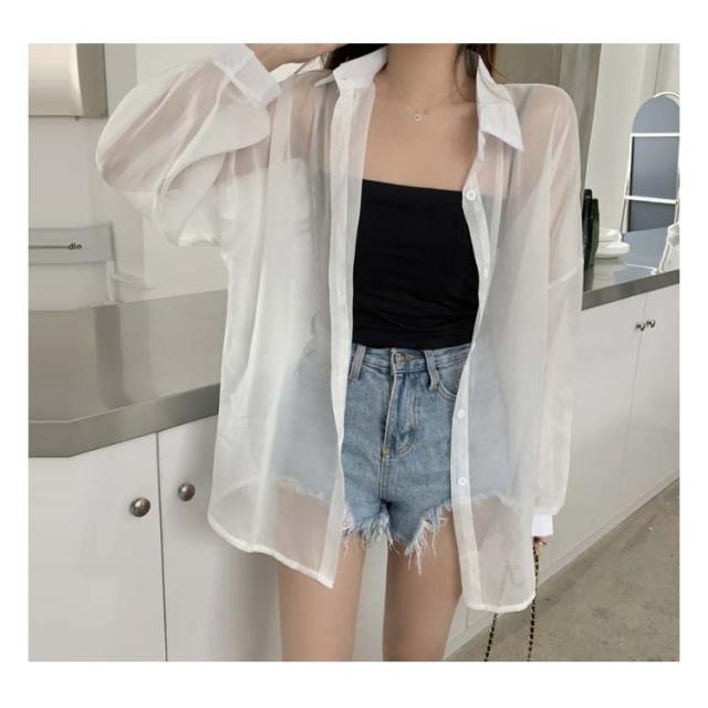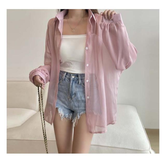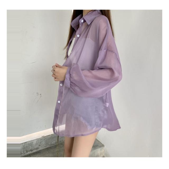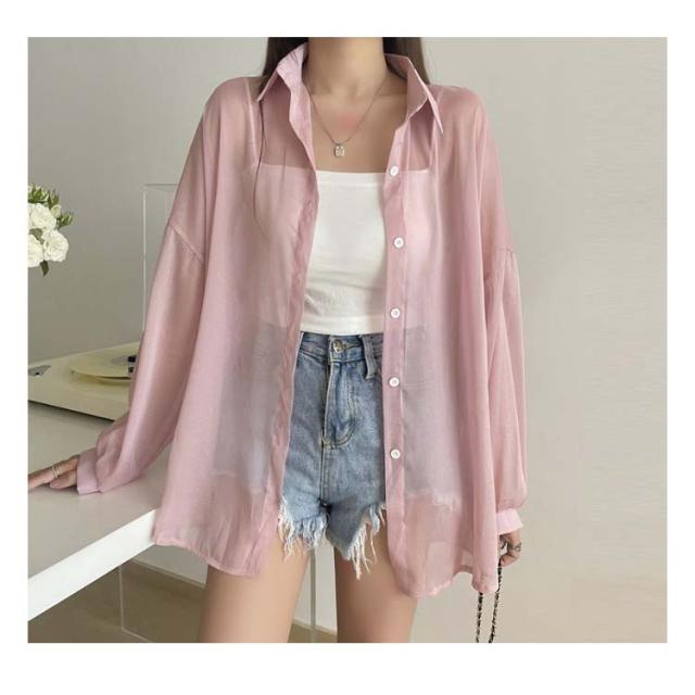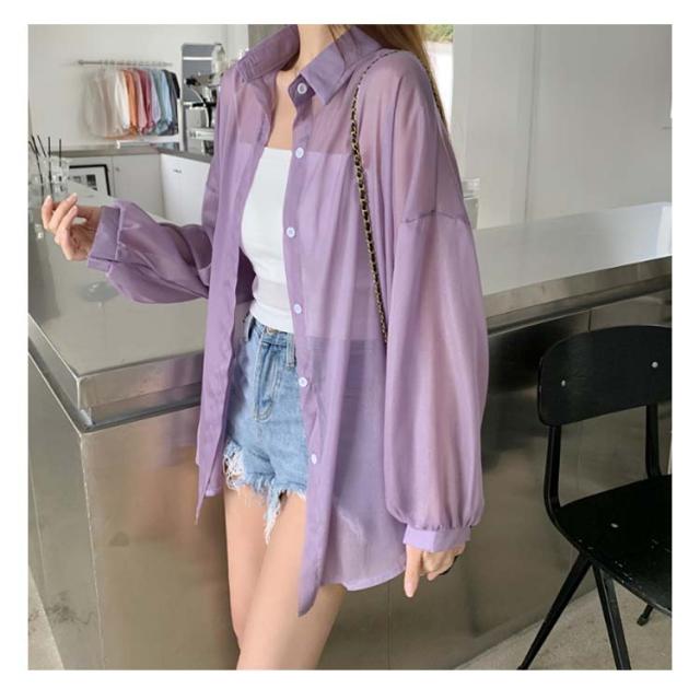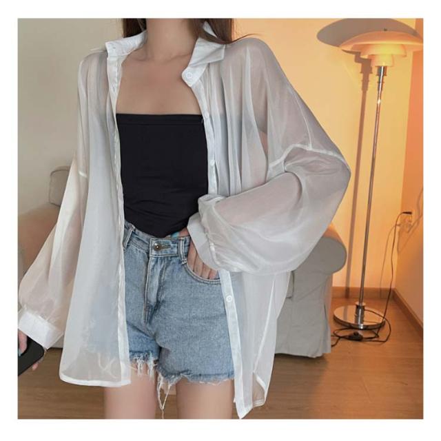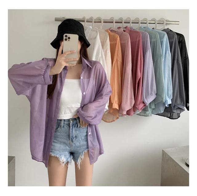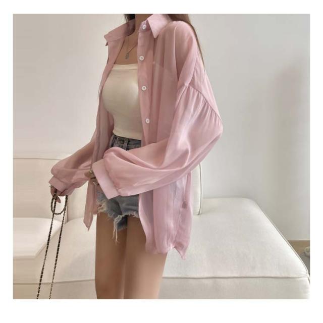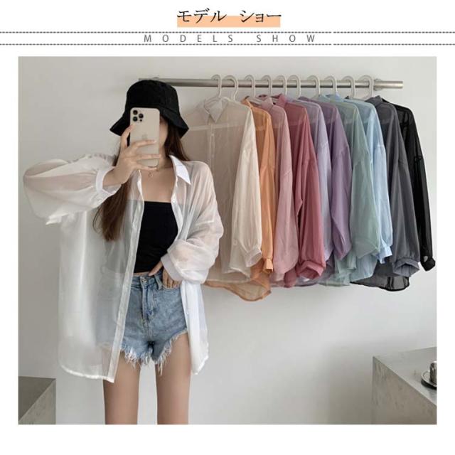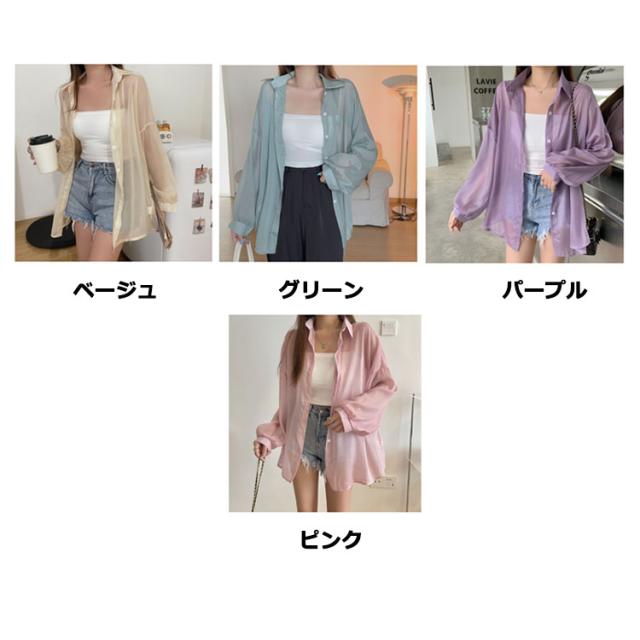 レディース シャツ ライトアウター トップス シアー 春 夏 長袖 シフォン ブラウス 羽織り シースルー 前開き 無地 薄手 透け感 ぽわん袖 ボリュームスリーブ オーバーサイズ ドロップショルダー レギュラーカラー