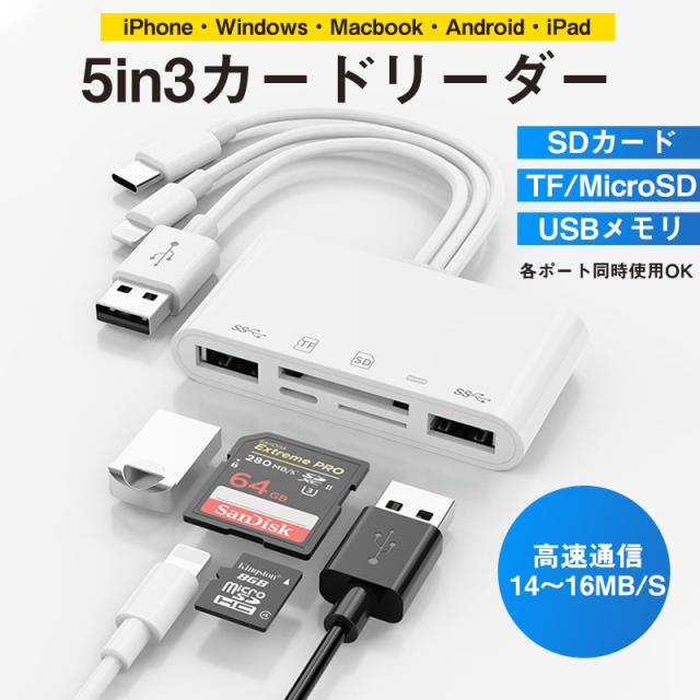 カードリーダー 5in3 iPhone iPad PC Android SDカード TFカード type-c 充電 USB3.0 母の日