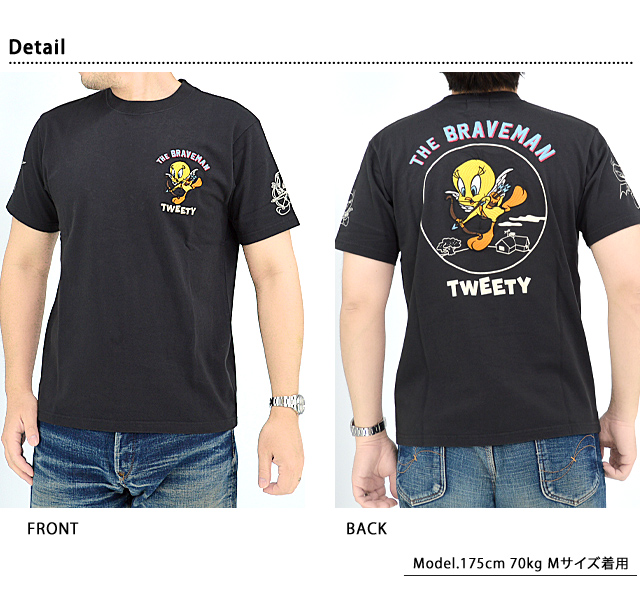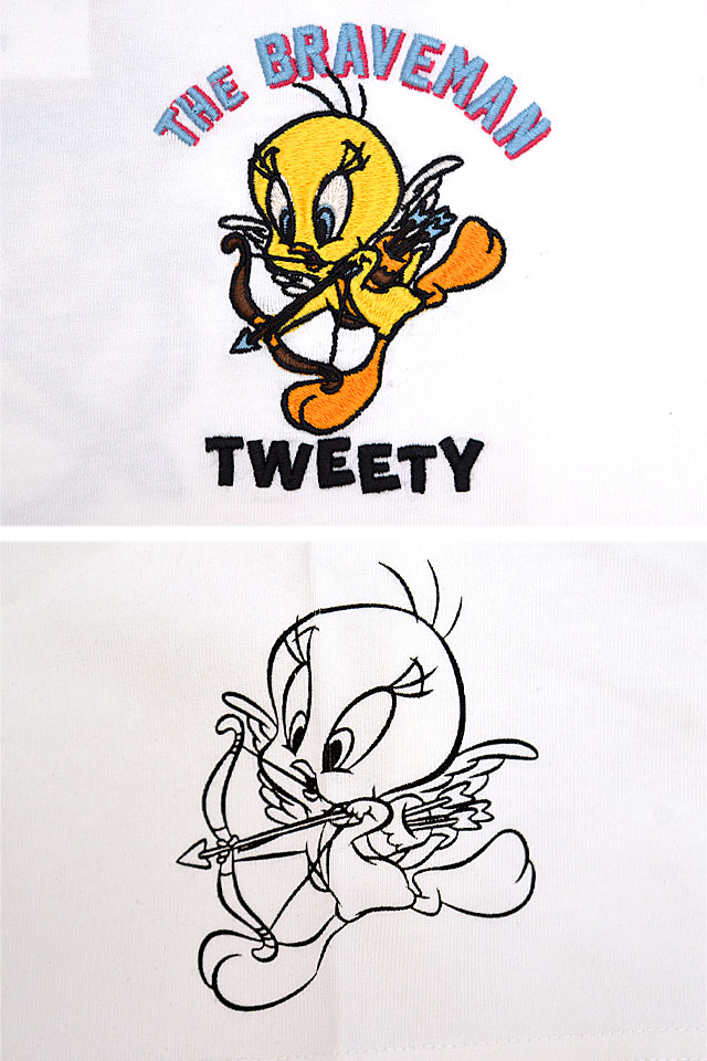 1920年代〜40年代にアメリカでワークウェアを中心とした製品を世に送り出したブランド「The BRAVE-MAN」から「BR×LOONEYコラボ 天竺半袖Tシャツ(LTB-2406)」のご紹介です。 アメリカのワーナーブラザーズが製作するアニメーション【LOONEY TUNES】の人気キャラクターをモチーフにしました! バックには天使に扮したトゥイーティーが刺繍で描かれています。 フロント左胸にも同様の絵柄をワンポイントで刺繍。 ボディーには、ややしっかりとした刺繍に負けない強さを持ったTシャツ生地を採用。 | |||||||||||||||||||||||||