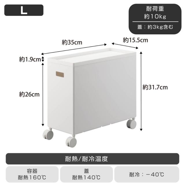 | サイズ | 本体:約 幅15.5×奥行35×高さ31.7(cm)(キャスター含む) 容器:約 幅15×奥行35×高さ26(cm) 蓋:約 幅15×奥行35×高さ1.9(cm) |