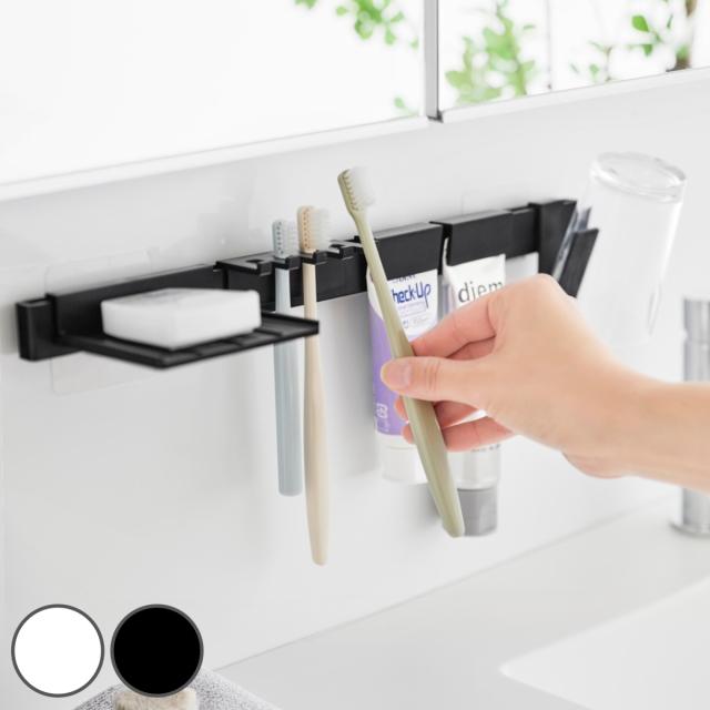フィルムフックで簡単に取り付けできる、歯磨き用品を1か所にまとめて収納できるセットです。歯ブラシハンガーは収納部分の幅が奥と手前で違うので、歯ブラシや電動歯ブラシのサイズに応じて使い分けできます。