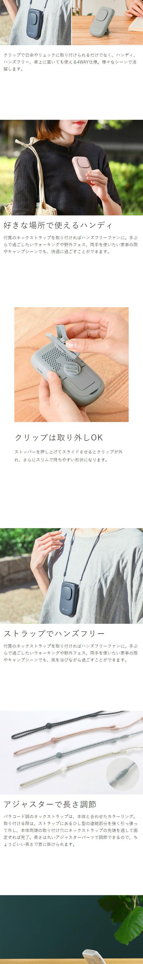 クリップ付きで日傘に取り付けられるUSB充電式のポータブルファン。クリップを外せばハンディファンや卓上ファンに、付属のストラップを付ければハンズフリーファンになる4WAY仕様です。