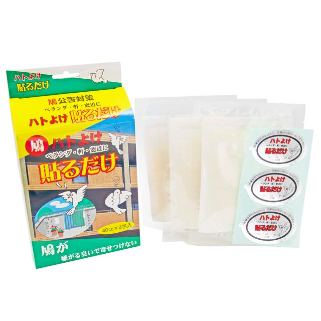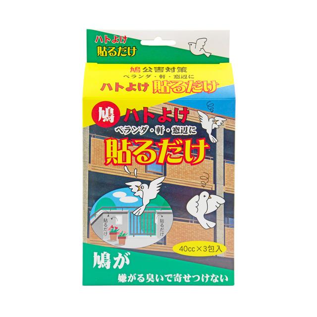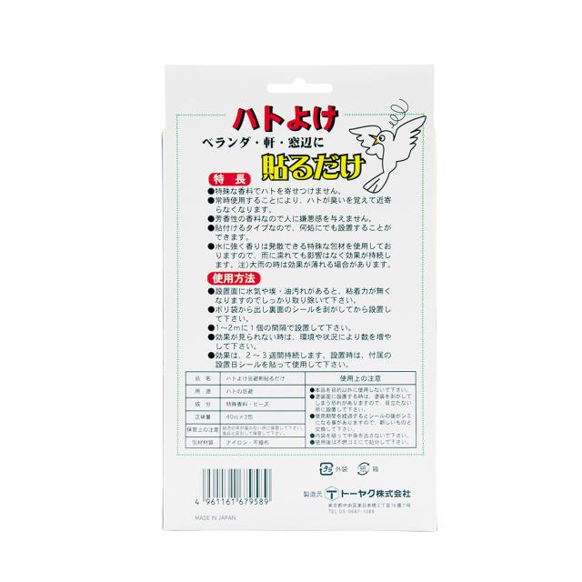 | 備考 | ・特殊な香料でハトを寄せつけない。 ・ベランダ、軒、窓辺に貼るだけ。 ・芳香性の香料で人に嫌悪感を与えない。 ・貼るタイプで何処にでも設置できる。 ・水に強く香りは発散できる特殊な包材を使用し、雨に濡れても影響はなく、効果を持続できる。 ・常時使用することにより、ハトが臭いを覚えて近寄らなくなる。 ・2〜3週間効果持続。 |