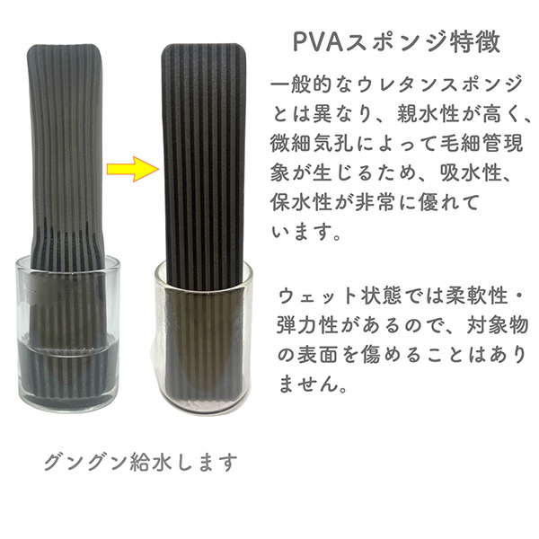 一般的なウレタンスポンジとは異なり、親水性が高く、微細気孔によって毛細管現象が生じるため、吸水性、保水性が非常に優れています。