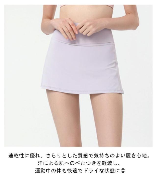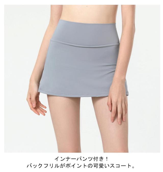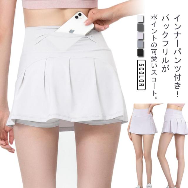 | インナーパンツ付き!バックフリルがポイントの可愛いスコート。 インナーパンツが付いてチラ見えの心配なく、よりアクティブな動きが楽しめます。 速乾性に優れ、さらりとした質感で気持ちのよい履き心地。汗による肌へのべたつきを軽減し、運動中の体も快適でドライな状態に◎ 伸縮性抜群!ヨガ、ランニング、トレーニング、テニス、ダンスなどにもおすすめ。 バッグのウエスト部分にはポケット付きでスマホを入れられて便利に使える♪ | |