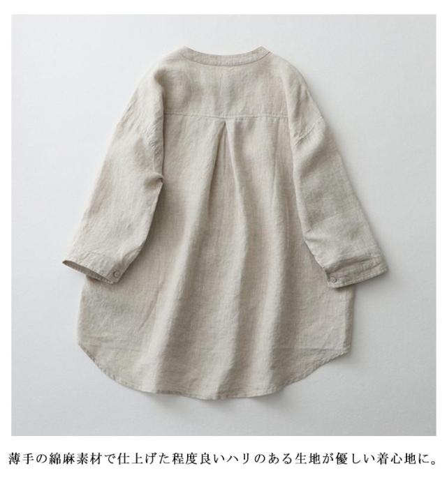 | 春夏に定番人気ある7分袖ノーカラーシャツ。 無駄の無いシンプルデザインです。 薄手の綿麻素材で仕上げた程度良いハリのある生地が優しい着心地に。 しっかり感ありつつ軽量でライトな質感は吸汗速乾でき、いつもさっらとした着心地。 羽織りや1枚着として、腰巻きや肩掛けなどにも◎ 合わせるボトムを選ばず、幅広いスタイリングで役立つ今年らしいアイテムです。 | |
