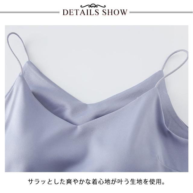 | 冷感素材使用、フォーマルなデザインに、カップ付きキャミソール。 きれいめ通勤スタイルからカジュアルスタイルまで、幅広く着回しが利くアイテムです。 つるつる素材にもデザインにこだわった一着。 スタイルを選ばず女性らしく、センス良くお洒落を叶えてくれる。 サラッとした爽やかな着心地が叶う生地を使用。 ノンワイヤータイプなので、ストレスフリー! | |