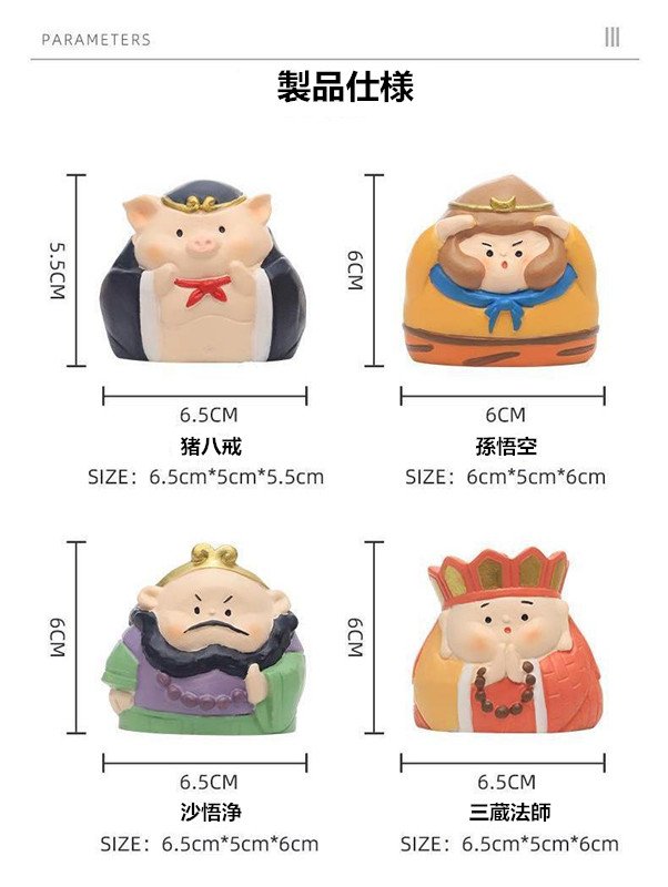 独立包装の人形はすべて3 dプロセス、手彩色、高精度、樹脂素材のため、可愛らしいデザインで大人気です。どこの国でもよく売れました。子供やフィギュア好きの方にプレゼントします。西遊記の物語は誰もが知っている伝奇で、西遊記の物語を寝る前に子供に聞かせます。