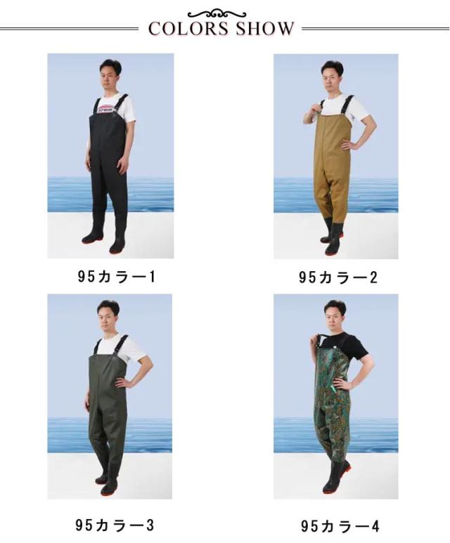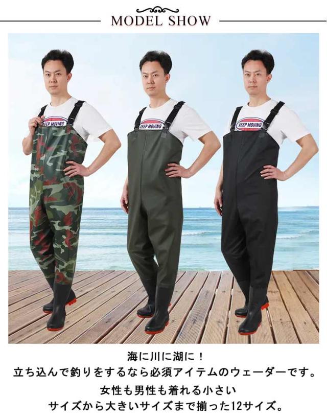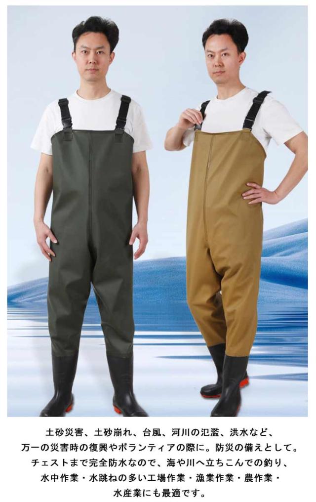 | 海に川に湖に!立ち込んで釣りをするなら必須アイテムのウェーダーです。 防汚性、耐久性に優れたこだわりの仕上がり! 女性も男性も着れる小さいサイズから大きいサイズまで揃った12サイズ。 土砂災害、土砂崩れ、台風、河川の氾濫、洪水など、万一の災害時の復興やボランティアの際に。防災の備えとして。 チェストまで完全防水なので、海や川へ立ちこんでの釣り、水中作業・水跳ねの多い工場作業・漁業作業・農作業・水産業にも最適です。 | |