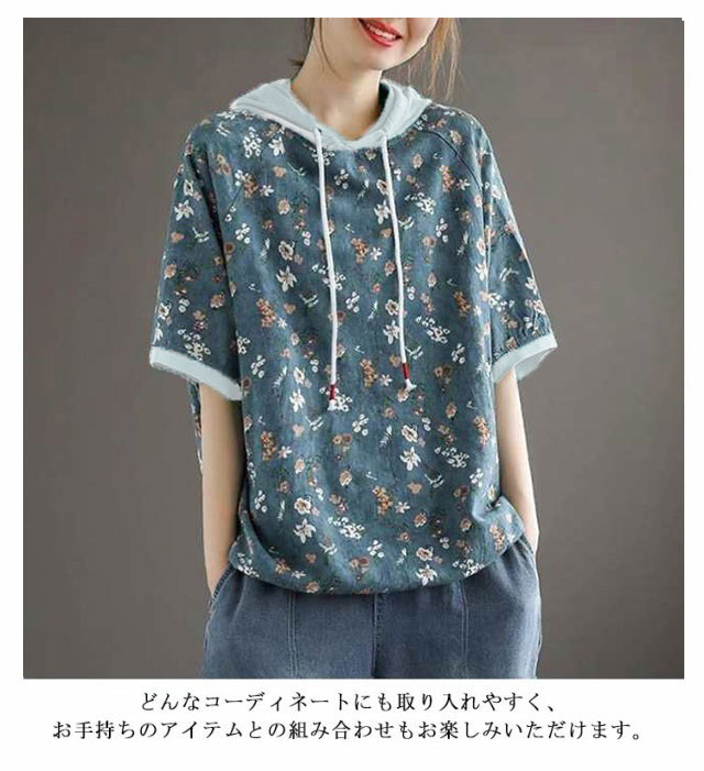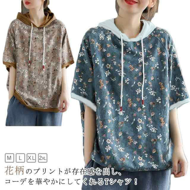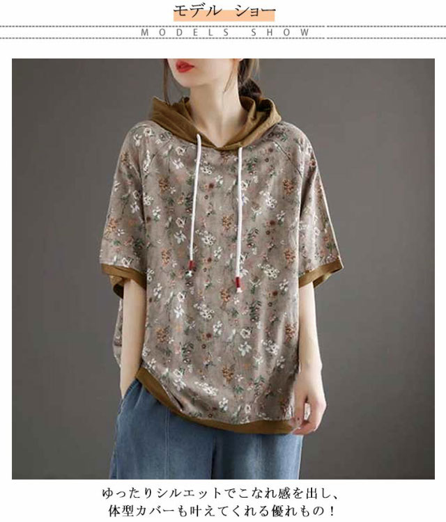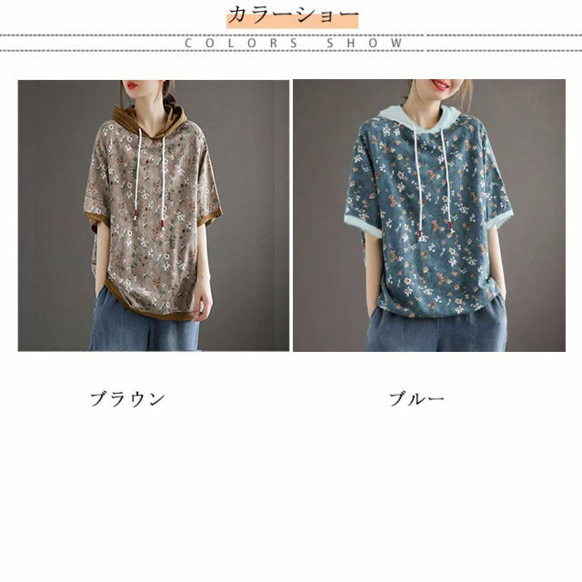 花柄 半袖シャツ パーカー レディース 半袖 フード付き Tシャツ 花柄 カットソー トップス フーディー 薄手 花柄Tシャツ 花柄パーカー チュニック プルオーバー シンプル 無地 夏物 カジュアル 体型カバー ブラウン ブルー