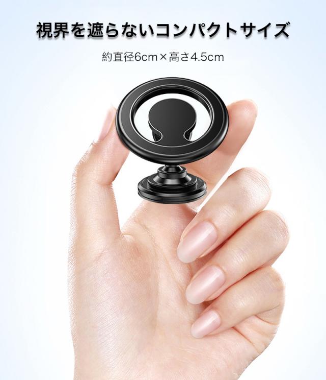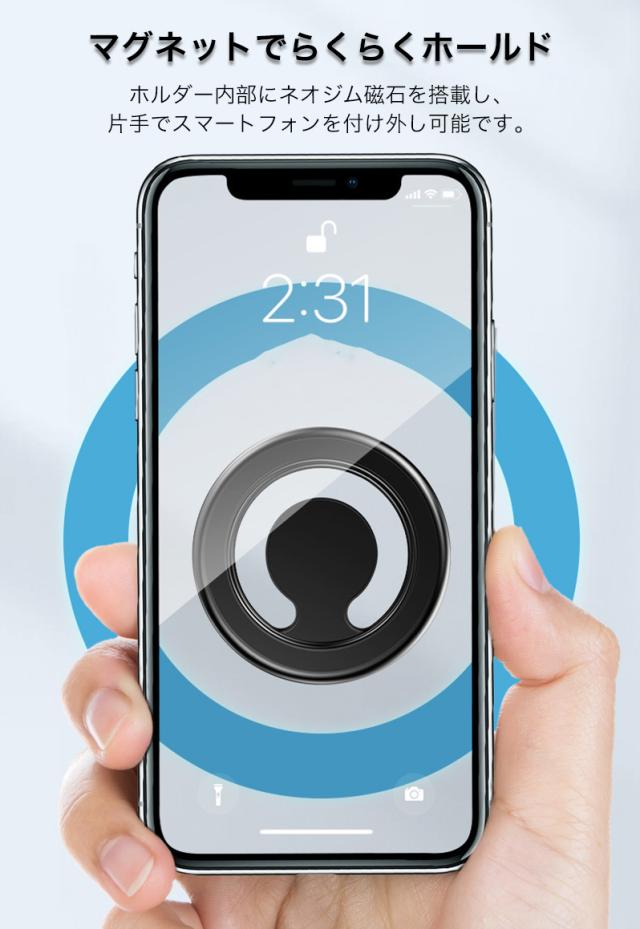 ホルダー内部にネオジム磁石を搭載し、片手でスマートフォンを付け外し可能です。