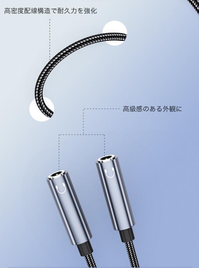 変換アダプタ Type-Cオス - 3.5mmステレオミニ端子メス 変換ケーブル 分岐ケーブル スマホ タブレット 二股イヤホン同時対応 2つに分配 シェア コネクタ アルミ ナイロン メッシュ 高耐久 丈夫 コンパクト スタイリッシュ