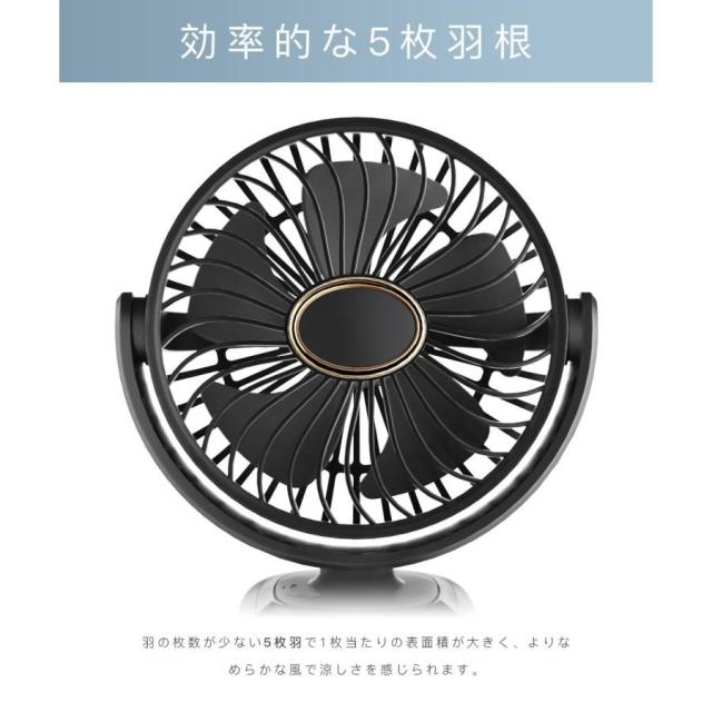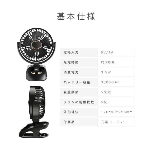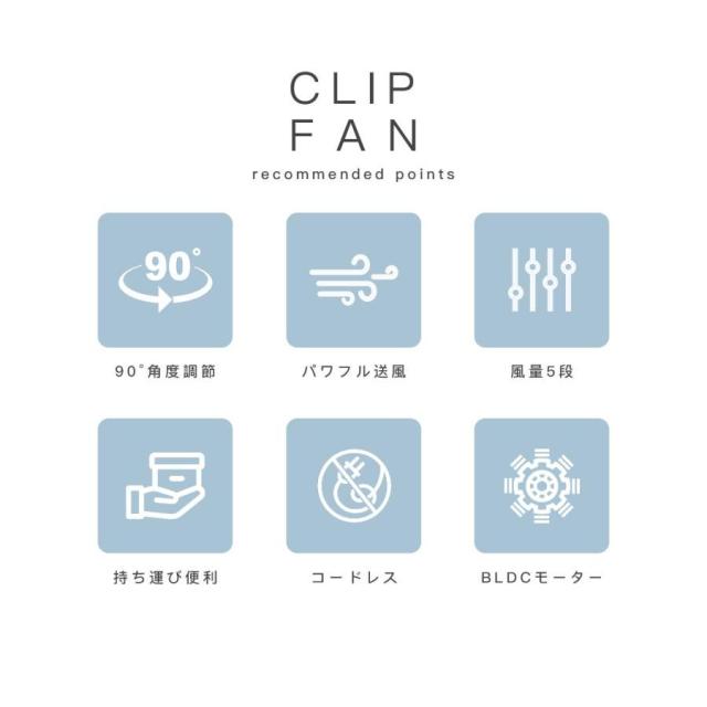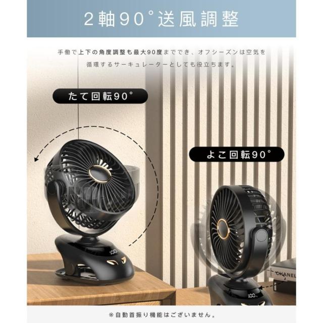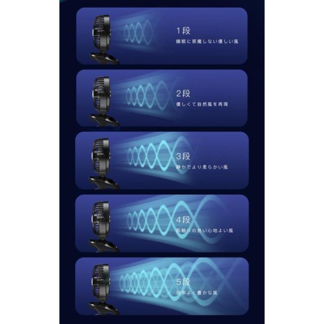 台座にクリップがついているので、様々な場所に取り付けて使うことが可能です。5段階の風量調節と90°角度調節機能も付いています。薄型設計なので、収納や出張時の携帯にも便利です。