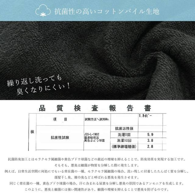 抗菌性の高いコットンパイル生地だから繰り返し洗っても臭くなりにくいです。