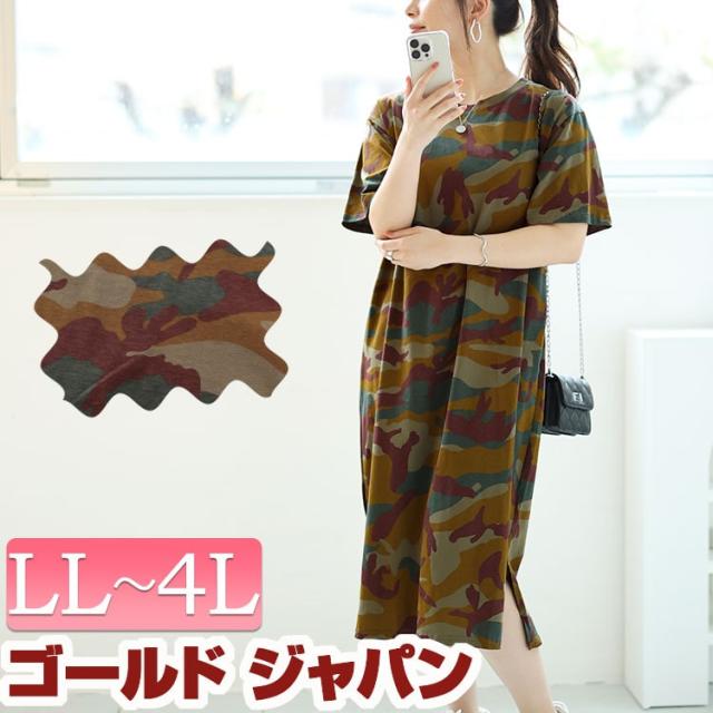 春新作 大きいサイズ レディース ワンピース 迷彩柄ロングワンピース ワンピ ロングワンピース ロング クルーネック 半袖 迷彩柄 柄服 カモフラージュ カモフラ Iライン スリット ストレッチ ルーム 韓国 韓国ファッション 夏服 秋服 LL 2L 3L 4L カーキ ゴールドジャパン
