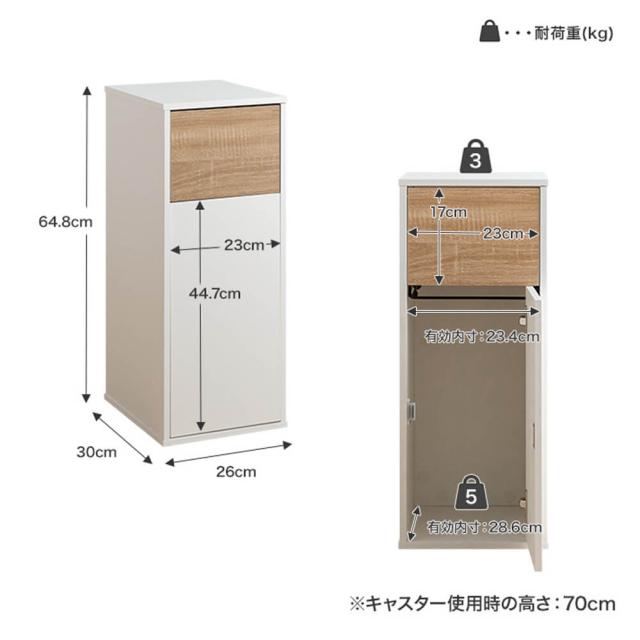 本体サイズ: 幅 26cm × 奥行 30cm × 高さ 64.8cm(キャスター使用時: 70cm)容量: 45L
