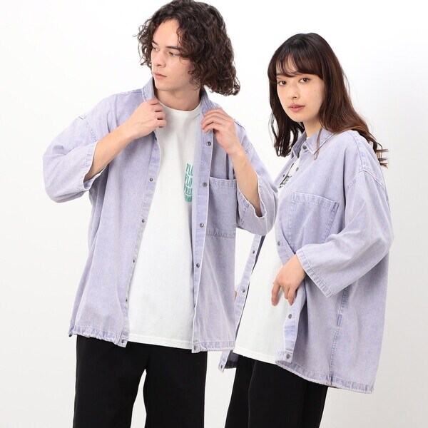 硫化染めデニムとインディゴ染めデニムにケミカルウォッシュ加工をかけて、古着のような雰囲気のある色合いに仕上げたシャツです。