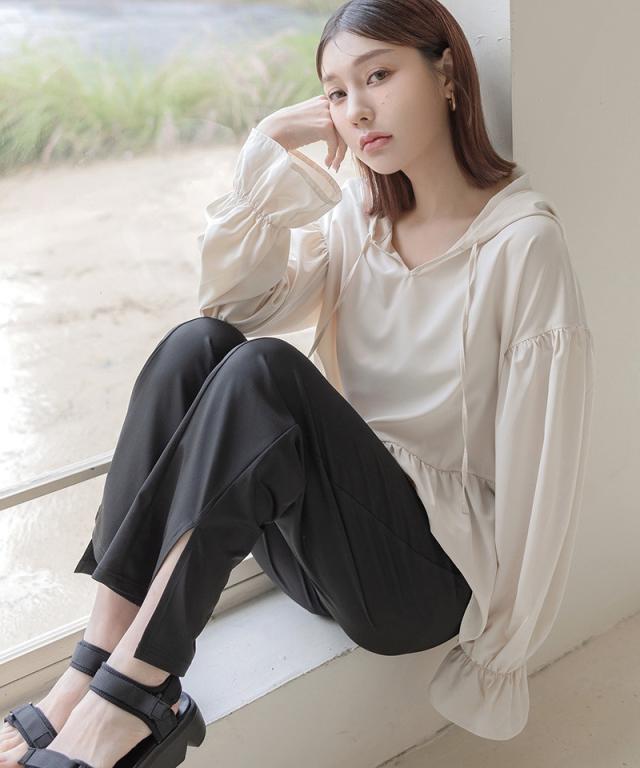 肩落ちシルエットで華奢見えが叶い、袖は手の甲までしっかりカバー。