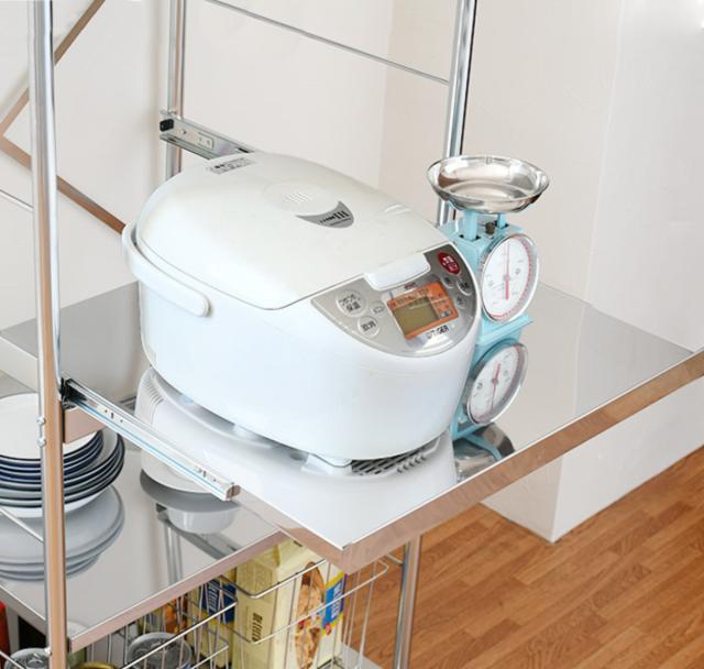 中段はスライド式のトレーになっています。置いたものが取り出しやすいだけでなく、炊飯器やポットの蒸気などを逃がすことができます。