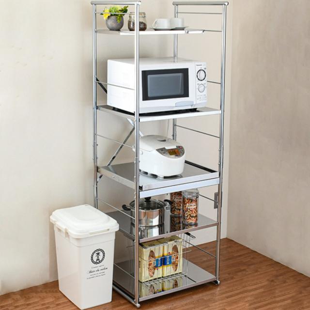 水はねや熱に強く、清潔感が感じられるステンレス製のハイタイプレンジ台です。食品ストックの置き場所としてはもちろん、大型レンジをはじめいろいろな形の調理家電をひとまとめに収納できます。