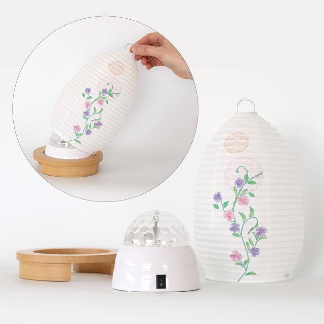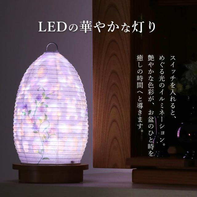 スイッチを入れると、めぐる光のイルミネーション。華やかな走馬灯は、あの人と、あの日の想い出を呼び起こしてくれそうです。火袋には淡くやさしく、すみれの花が描かれ、明かりを灯さない時はしっとりと落ち着いた和のアイコン、伝統的な和紙提灯の趣き。ころんと可愛らしくも、和紙の質感と繊細な明かりを灯す、盆提灯です。