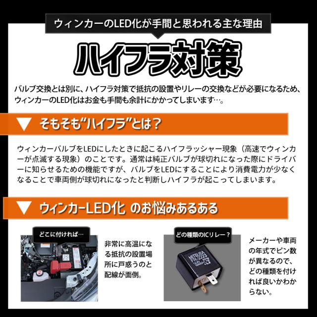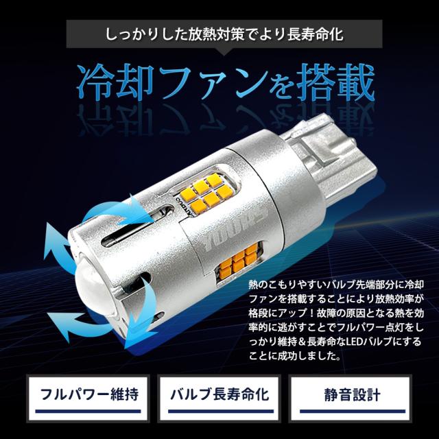 極性を気にすることなくすぐに取付が可能。 ■冷却ファン搭載 しっかりした放熱対策でより長寿命化! 熱のこもりやすいバルブ先端部分に冷却ファンを搭載することにより放熱効率が格段にアップ! 故障の原因となる熱を効率的に逃がすことでフルパワー点灯をしっかり維持&長寿命なLEDバルブにすることに成功しました。 ■抵抗内蔵で誰でも簡単LED化 交換するだけでキレも抜群のLEDウィンカーに!ファッション性も格段にUP! 別途抵抗不要! LEDウィンカーバルブにハイフラ防止機能が内蔵されているので、抵抗を取り付ける必要がありません! 純正バルブとの交換だけでいいので取付も簡単に! 手間も時間もかけずにキレのある明るいLED点滅を、ご自身のお車で楽しむことができます。 |
