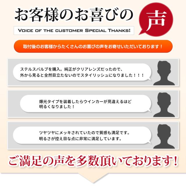本製品にはLEDチップカバーにもメッキ塗装を施す事によりフルメッキで完全ステルス化を実現! 純正は非点灯時にレンズ内にオレンジ色が映り込み、せっかくのクリアレンズが台無しに… LEDバルブは、非点灯時の余計な映り込みも無く、すっきりシャープなライト回りになり、ファッション性も格段にアップします! 明るさは、2000LMの爆光バルブにはやや劣りますが純正よりも明るく、抵抗内蔵タイプなのでポン付けでキレのあるLEDの点滅を楽しめます。 |