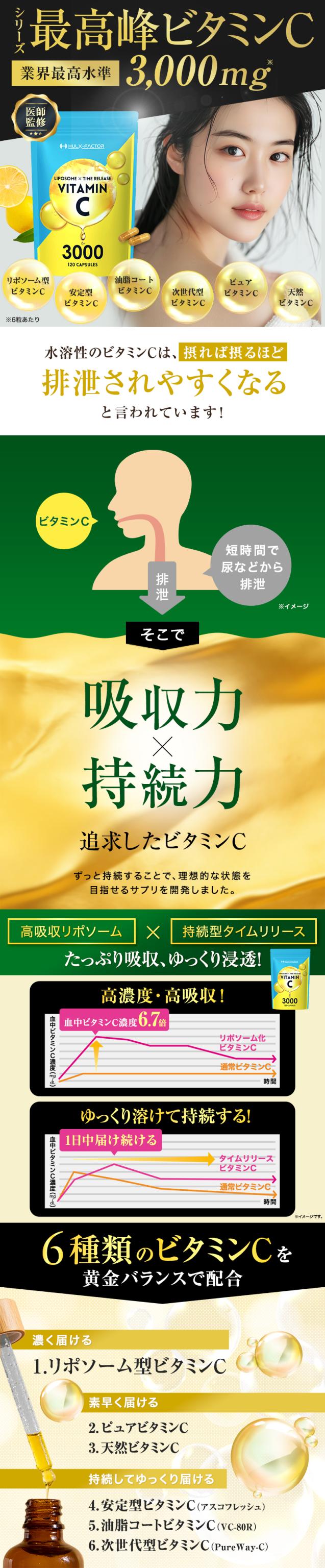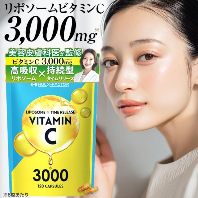 10%OFFクーポン配布中![送料無料] 高吸収 リポソーム 持続型 タイムリリース 高濃度 ハルクファクター ビタミンC 3000mg 120粒 サプリ 医師監修 美容 健康 ビタミンC誘導体 日本製 カプセル