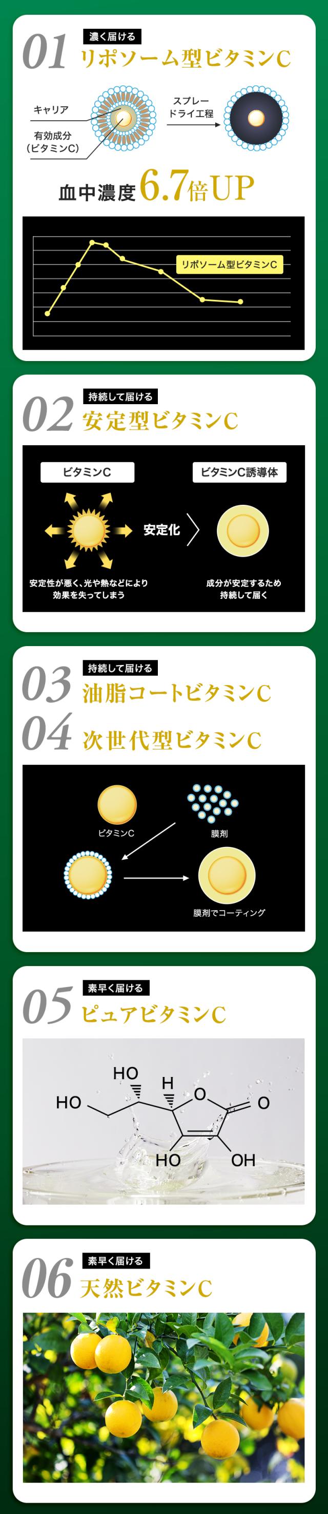 【6種類のビタミンCを贅沢配合】リポソーム型ビタミンC、安定型ビタミンC(ビタミンC誘導体)、油脂コートビタミンC、次世代型ビタミンC、ピュアビタミンC、天然ビタミンCの6種類が配合。それぞれの特性を活かし、ビタミンCの吸収性を最大限高めるべく、独自配合を施した"パーフェクトビタミンCサプリメント"です。