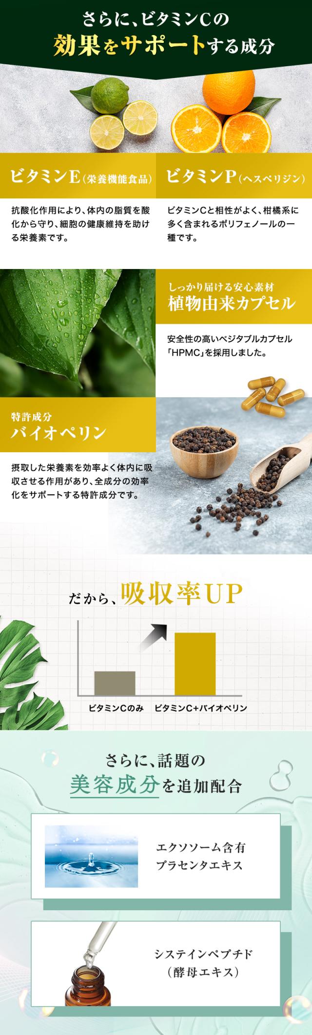 【先進の美容成分配合】ビタミンCと相性の良いビタミンE(栄養機能食品)とビタミンP(ヘスペリジン)、吸収率をUPさせる特許成分バイオペリン、さらに先進の美容成分エクソソーム(含有プラセンタエキス)、グルタチオン(含有酵母エキス)を贅沢に同時配合しました。