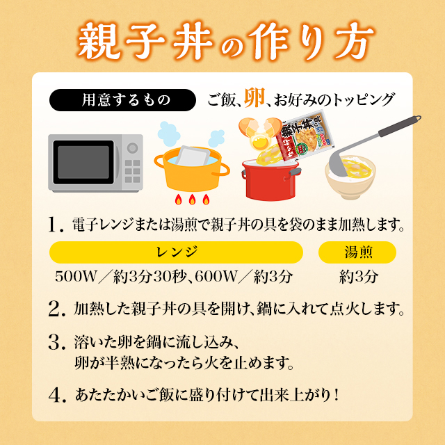 ・親子丼の具以外に用意するのは、卵とご飯だけ。