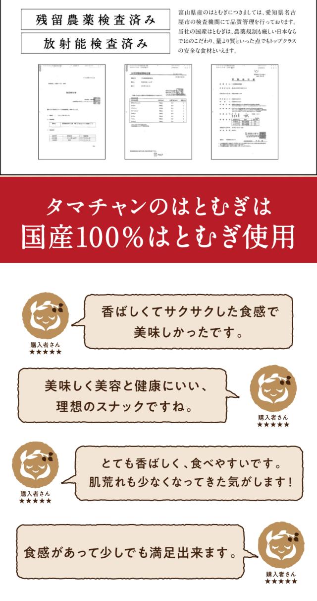 タマチャンのはとむぎは、国内自給率わずか8%という少ない国内産ハトムギを採用。はとむぎの良さを100%引き出すために、ひと手間もふた手間もかけて外皮を取り除き、焙煎したこだわりの商品です。