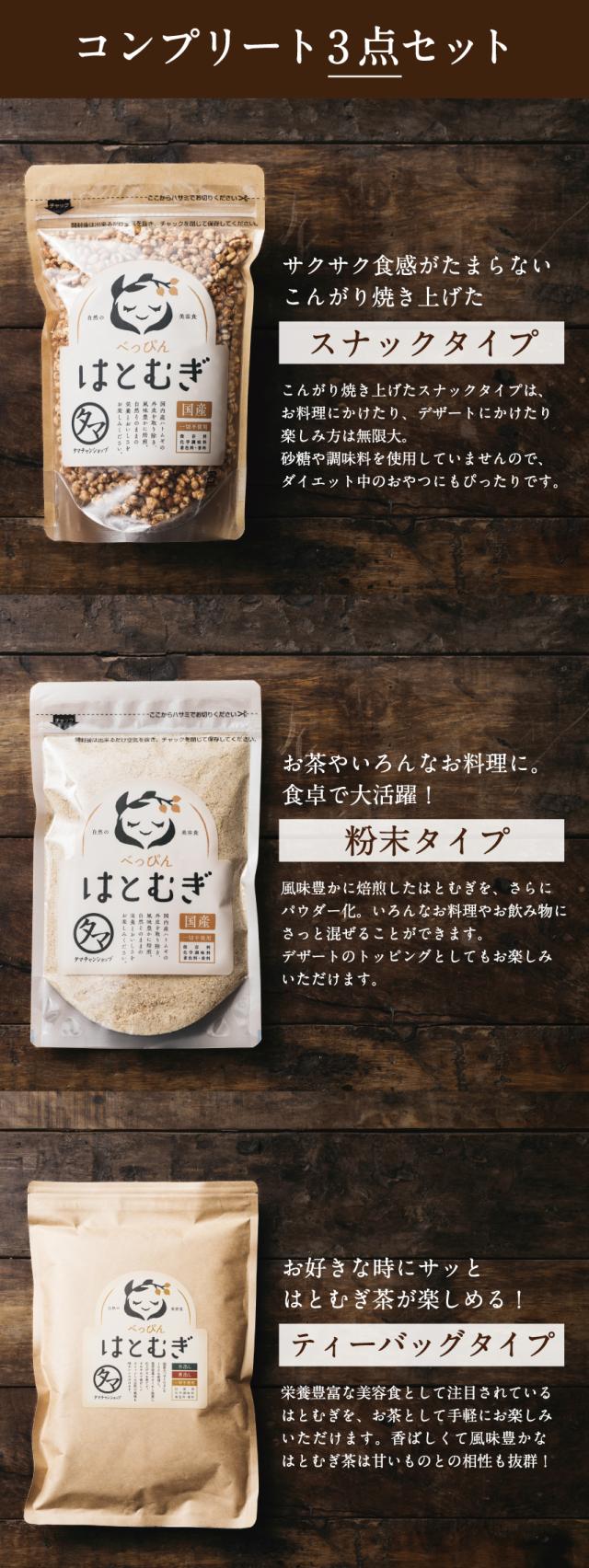 [商品名]べっぴんはとむぎコンプリートセット(スナック150g・粉末150g・ティー30包)