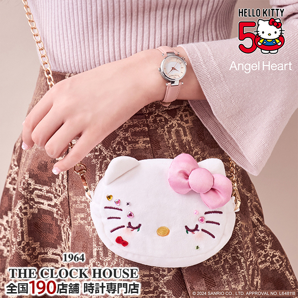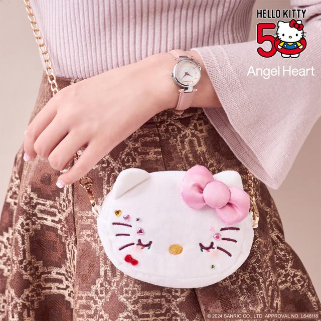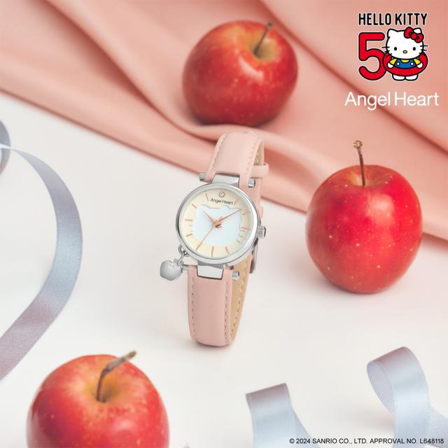 2024年で20周年を迎えたエンジェルハートと50周年を迎えたハローキティを記念してコラボレーションモデルが登場です。ハローキティのフェイスシルエットがくり抜かれたレイヤード調の立体感のある文字盤がポイントです。また、身長リンゴ5個分、体重リンゴ3個分とハローキティに縁のあるリンゴモチーフのチャーム付きとなっており、ケースバックにはハローキティ50周年のロゴが入っています。コラボレーションモデルには、ハローキティのフェイス型ポーチが付属します。