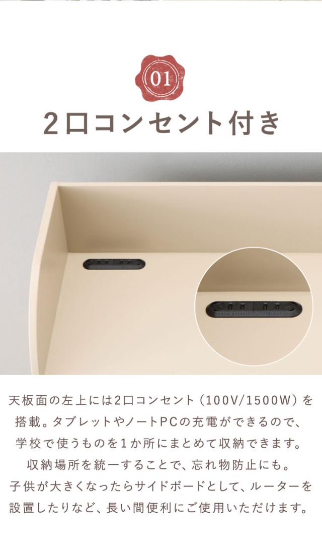 天板面の左上には2口コンセント(100V/1500W)を搭載。タブレットやノートPCの充電ができるので、学校で使うものを1か所にまとめて収納することができます。収納場所を統一することで、忘れ物防止にも。