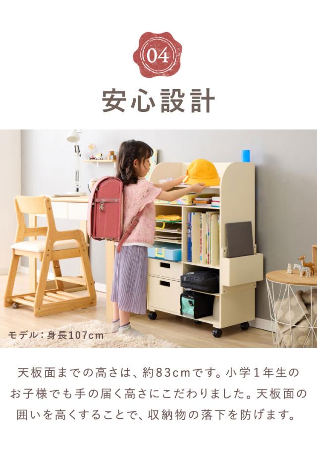天板面までの高さは、約83cmです。小学1年生のお子様でも手の届く高さにこだわりました。※モデル107cm