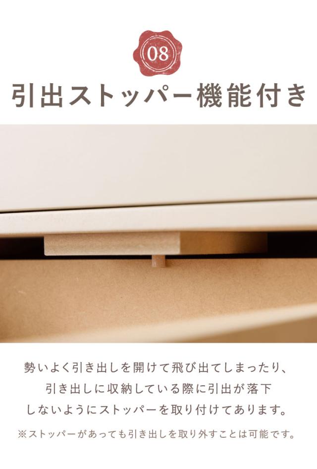 勢いよく引き出しを開けて飛び出てしまったり、引き出しに収納している際に引出が落下しないようにストッパーを付けました。※ストッパーがあっても引き出しを取り外すことは可能です。