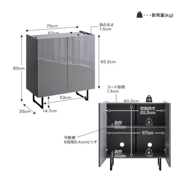 耐荷重: 天板 約10kg 、可動棚 約5kg、底板 約6kg